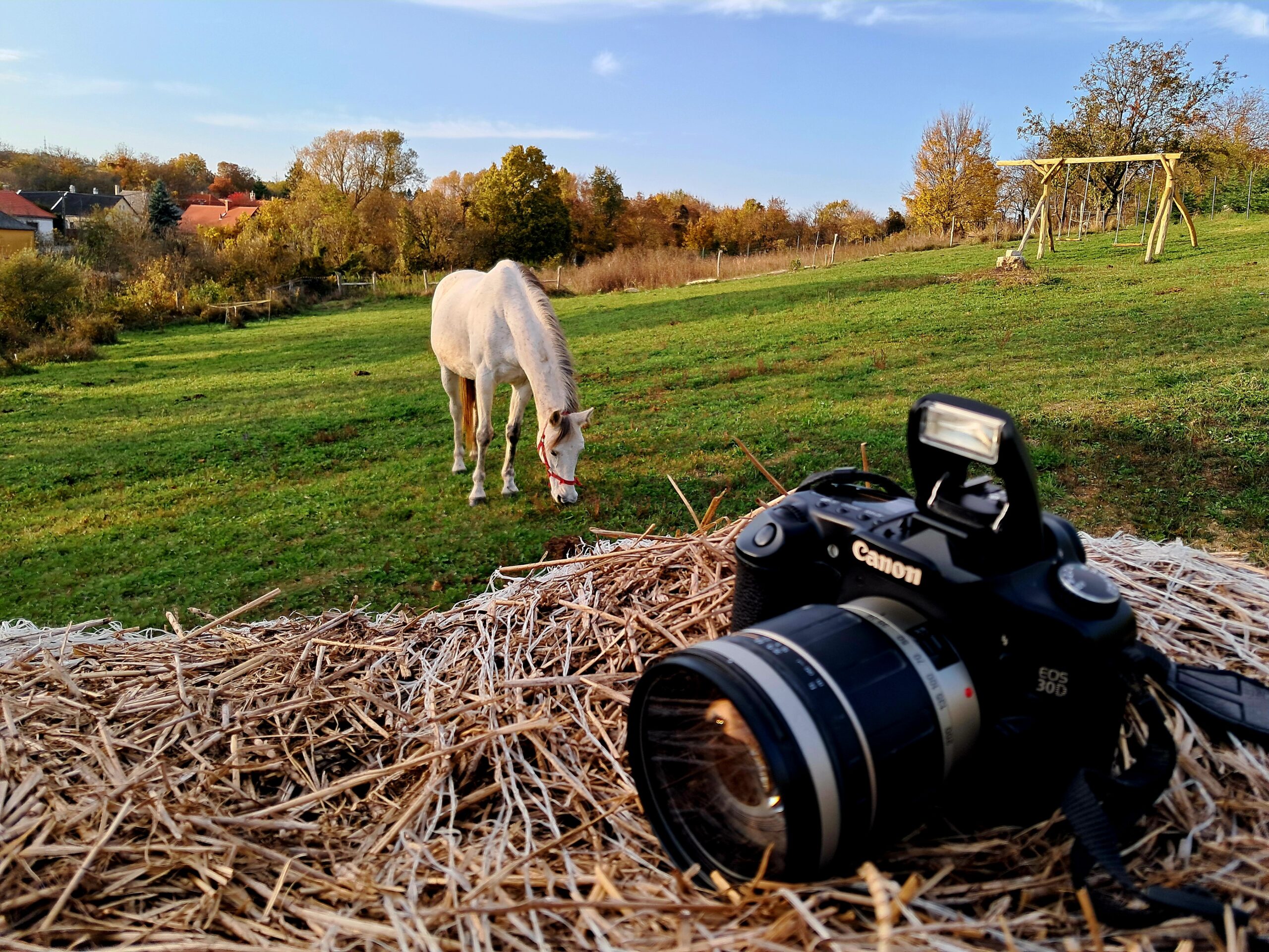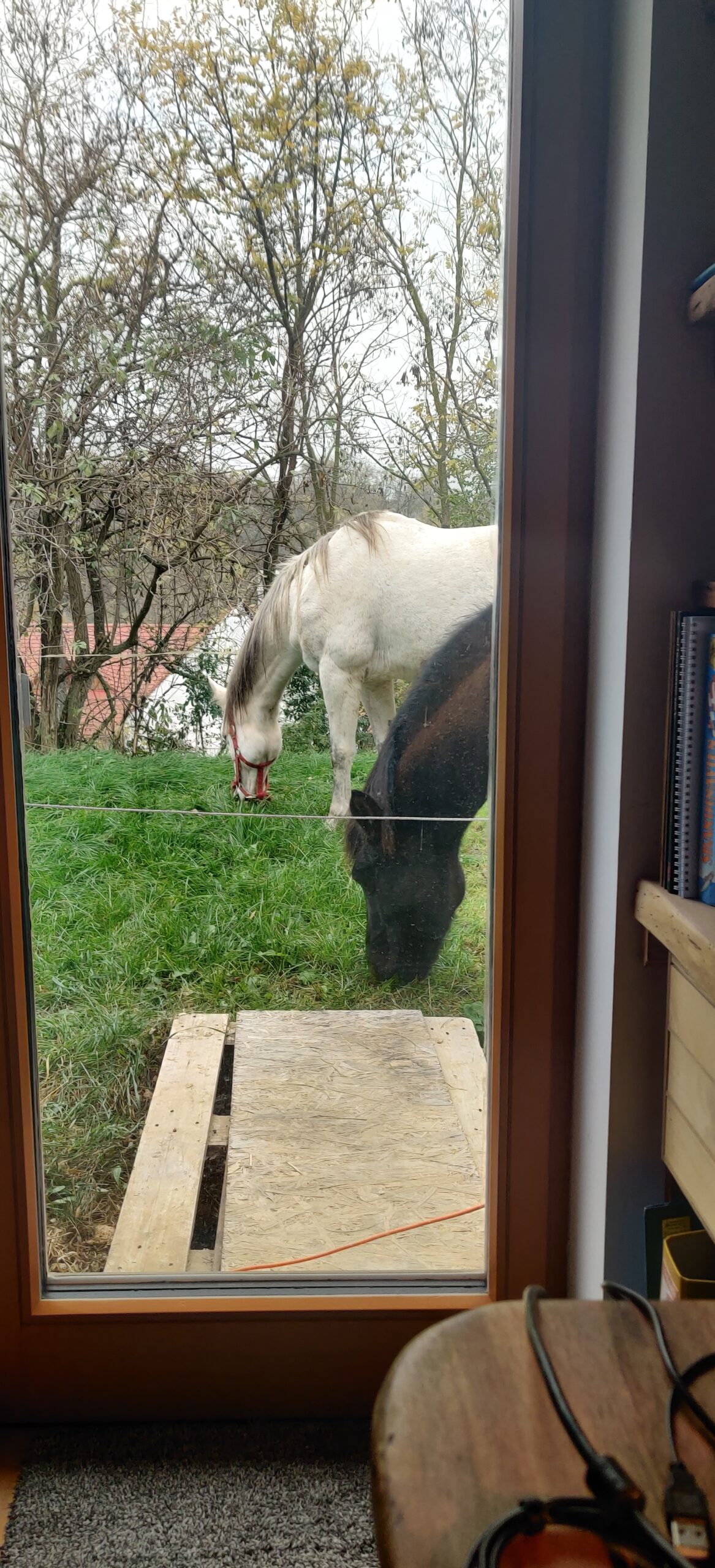 Ahogy ülök a gépemnél és írom ezeket a sorokat az asztalomtól 2-3 méterre lovak legelnek a kertünkben. Az itt látható képeket a házunk ablakából fotóztam. Sok éve a lovak benne voltak a belső képeinkben, ma pedig itt legelnek a kertünkben. Nem a saját lovaink (az egyik szomszéd legeltet nálunk), nem a mi gondunk, de mi a gyönyörűségünk. Természetesen kutyánk is van és a macskánk a faluban lakik. Létezik ennél nagyobb csoda?